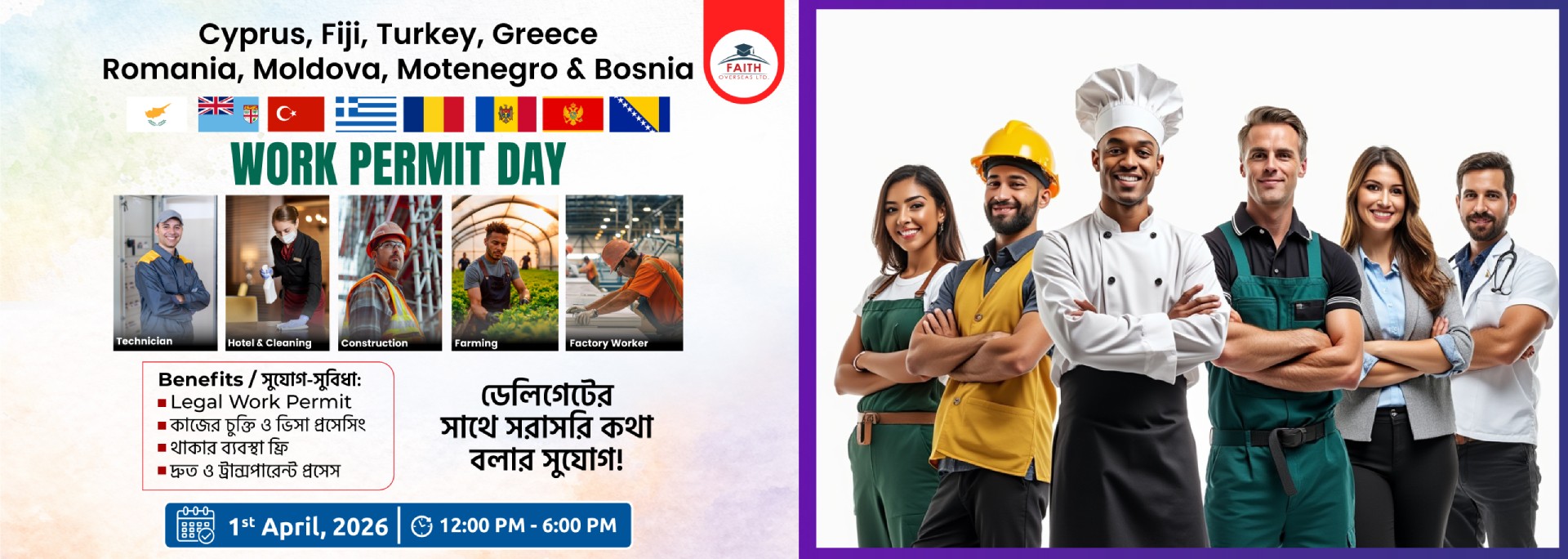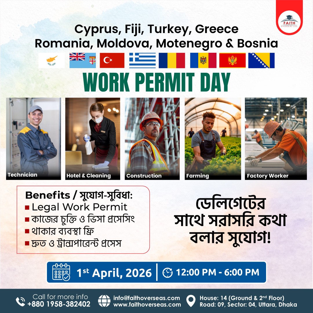 Cyprus, Fiji, Turkey, Greece, Romania, Moldova, Montenegro & Bosnia–এ বৈধভাবে কাজ করার সুযোগ নিয়ে আয়োজন করা হয়েছে Faith Overseas Ltd. Work Permit Day। এই বিশেষ সেশনে আপনি সরাসরি ডেলিগেটের সাথে কথা বলতে পারবেন এবং জানতে পারবেন বিদেশে কাজের সম্পূর্ণ প্রসেস সম্পর্কে।