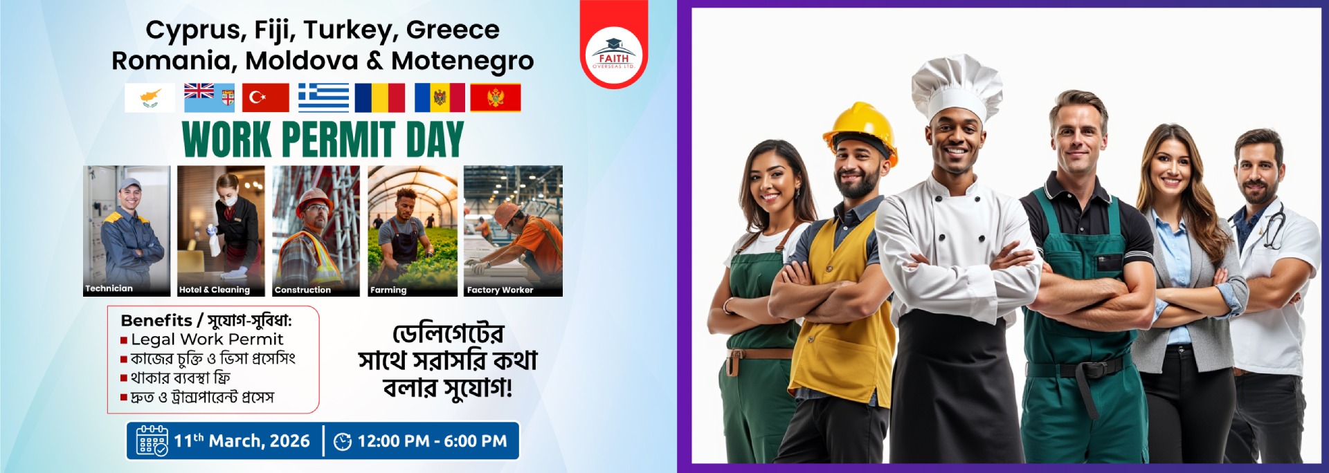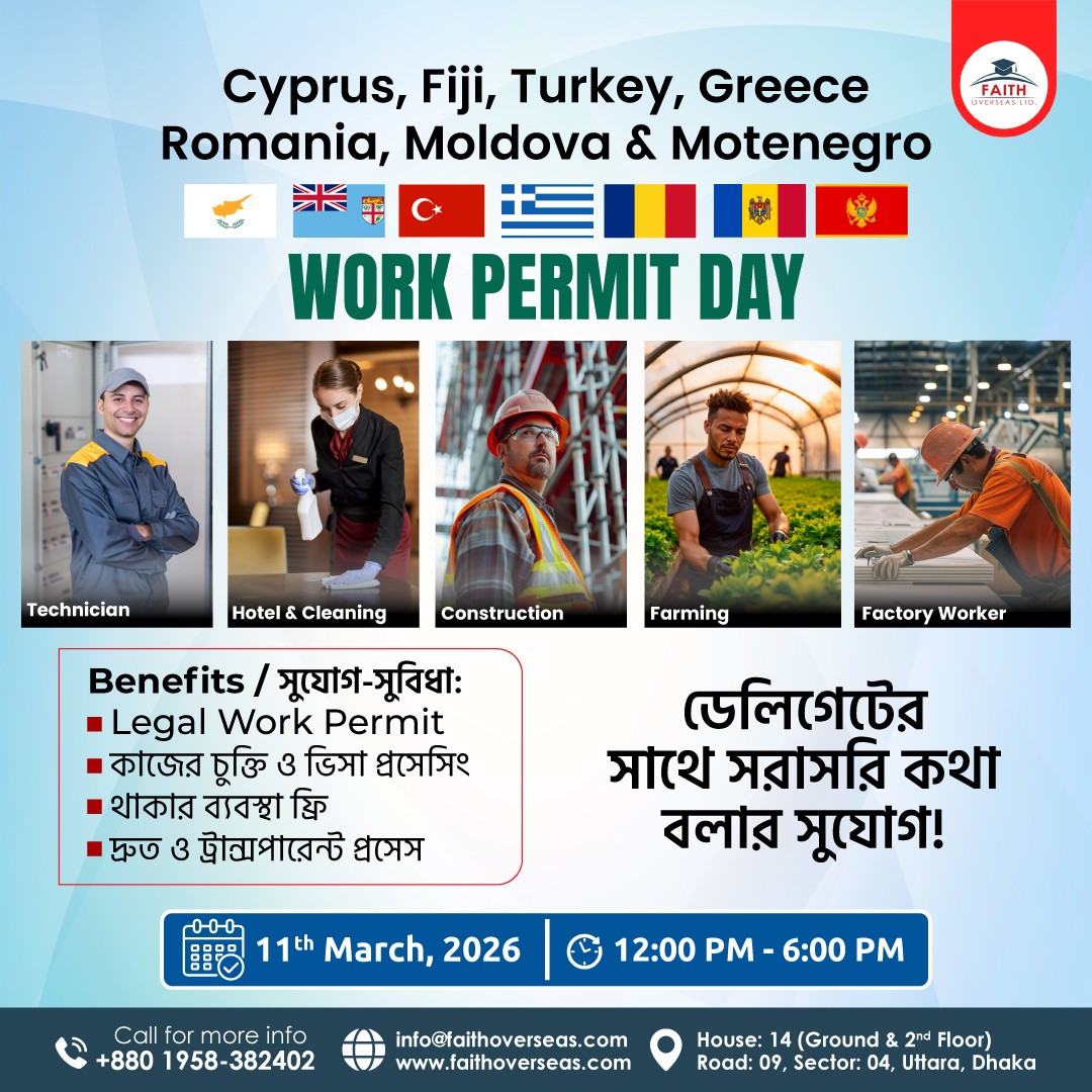 Cyprus, Fiji, Turkey, Greece, Romania, Moldova & Montenegro–এ বৈধভাবে কাজ করার সুযোগ নিয়ে আয়োজন করা হয়েছে Faith Overseas Ltd. Work Permit Day। এই বিশেষ সেশনে আপনি সরাসরি ডেলিগেটের সাথে কথা বলতে পারবেন এবং জানতে পারবেন বিদেশে কাজের সম্পূর্ণ প্রসেস সম্পর্কে।