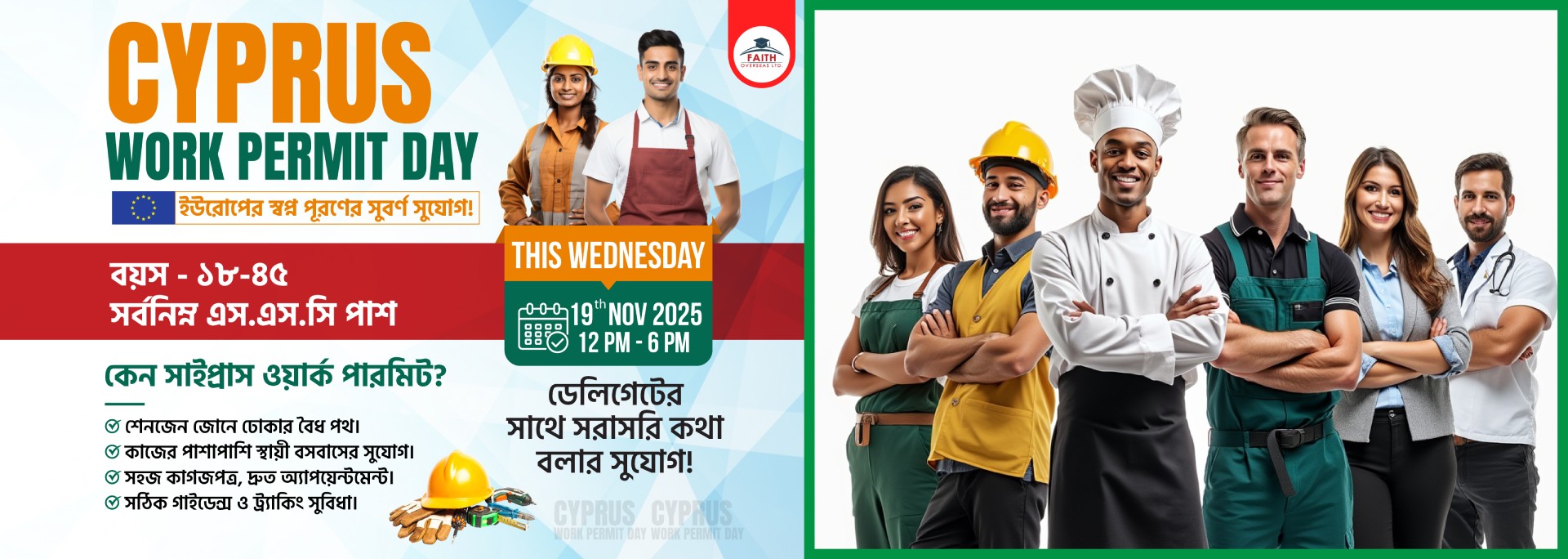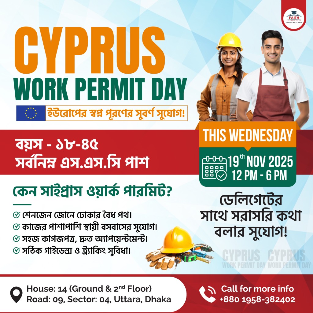 👉Faith Overseas Ltd. নিয়ে আসছে সেই স্বপ্ন বাস্তবায়নের অসাধারণ সুযোগ! 📢 আগামী ১৯শে নভেম্বর, ২০২৫ (বুধবার) Faith Overseas Ltd. আয়োজন করছে Cyprus Work Permit Day!